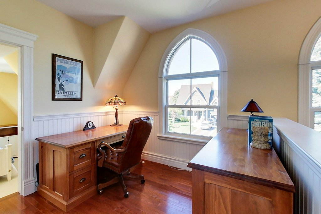 This beautifully maintained home blends Victorian charm with modern amenities, featuring 3 spacious bedrooms, 2 full bathrooms, 1 half bath, a home office, cathedral windows throughout, and an attached garage. A picture-perfect sunroom and two fireplaces brings warmth and character to the home, setting the stage for the perfect après-ski. The oversized back deck—with gas BBQ hookup—overlooks the extra-deep lot, where a charming miniature red brick shed at the back of the garden provides a delightful focal point. The outdoor space offers plenty of room for kids to play, dogs to run, or everyone to gather for s’mores around the firepit as the sun sets over the escarpment.